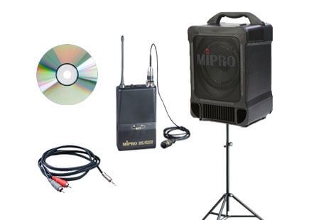 Industry leading portable unit with built in battery power, 1 x cable microphone input, Aux input and the ability for up to 4 wireless microphones (optional).